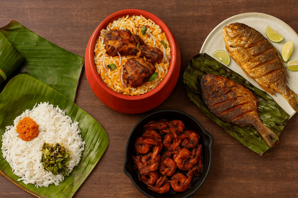 - Fish Pollichath*: Spicy marinated fish grilled in banana leaf